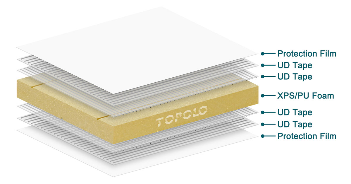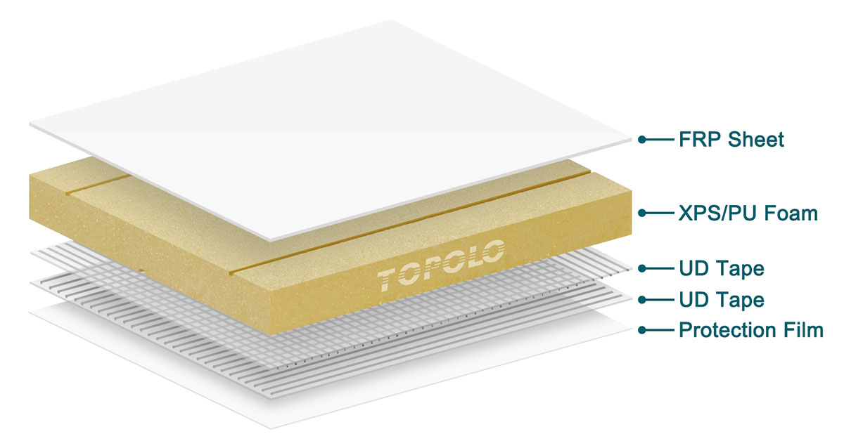 - Panneaux de boîte : panneaux sandwich en mousse XPS (la peau extérieure est en PRF, la peau intérieure est en CFRT).