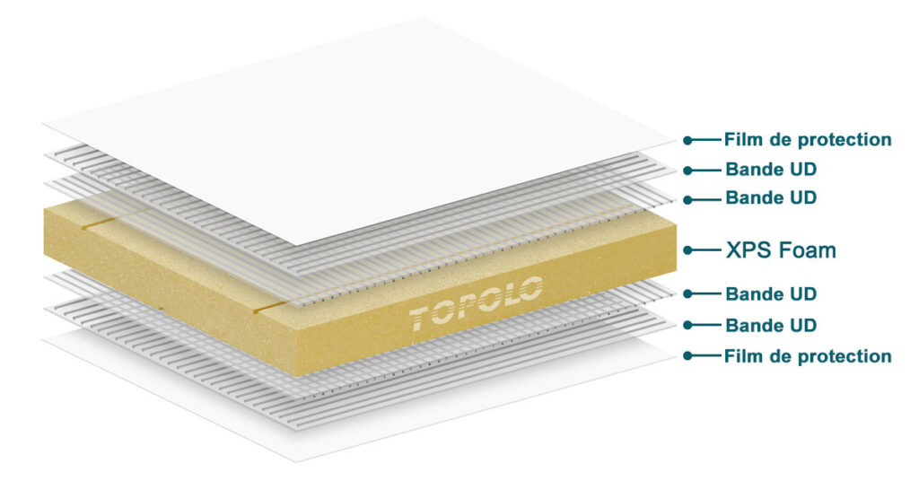 • Noyau : mousse XPS (polystyrène extrudé). (Densité : 35-50kg/m³)