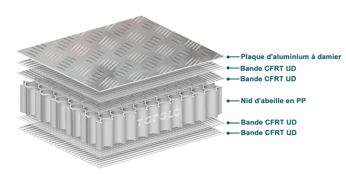Ce panneau composite associe une tôle d’aluminium antidérapante à damier à une âme en nid d’abeille de polypropylène (PP) thermoplastique, le tout étant collé à l’aide d’un adhésif structural haute résistance. Il représente la fusion parfaite entre la durabilité du métal et la légèreté des composites polymères.