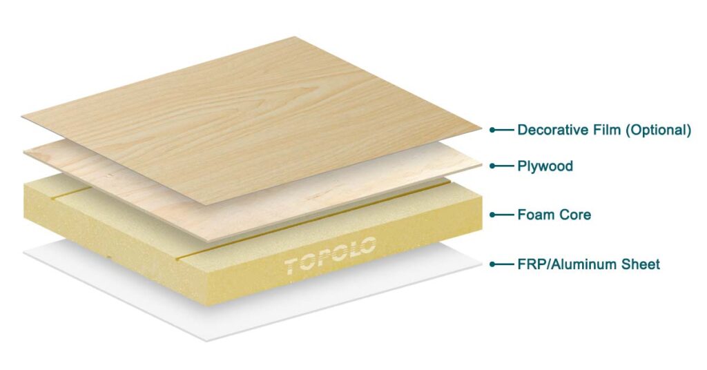 Lorsqu’il est utilisé comme revêtement, le contreplaqué est populaire dans les industries du meuble et de la décoration intérieure. Comme alternative aux panneaux de bois massif, les panneaux en mousse de contreplaqué sont économiques, respectueux de l’environnement et faciles à couper. Nous produisons des panneaux sandwich à âme en mousse de contreplaqué à revêtement double face et en contreplaqué simple face. Ces panneaux composites peuvent être personnalisés en termes de taille, de traitement de surface et de matériau en mousse pour répondre à des besoins spécifiques.