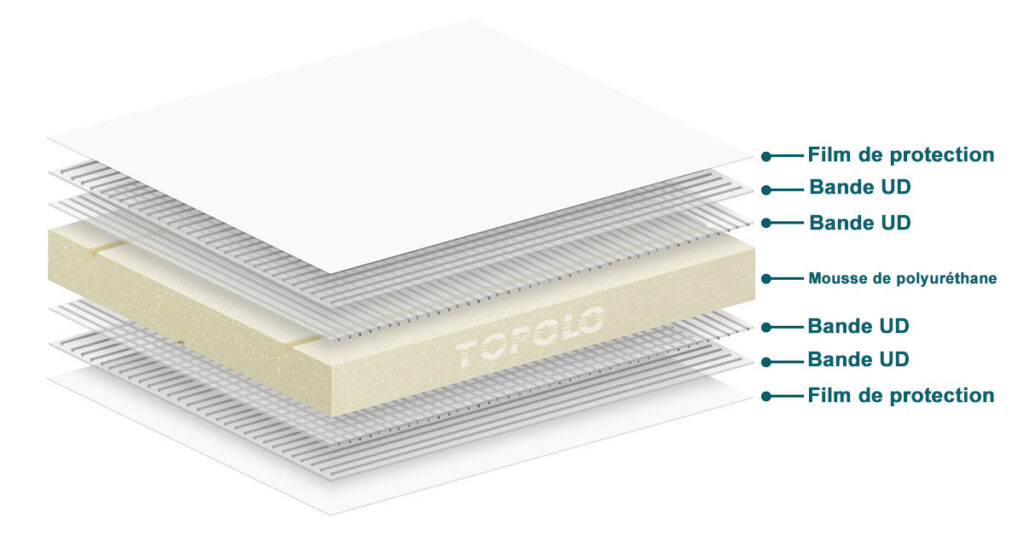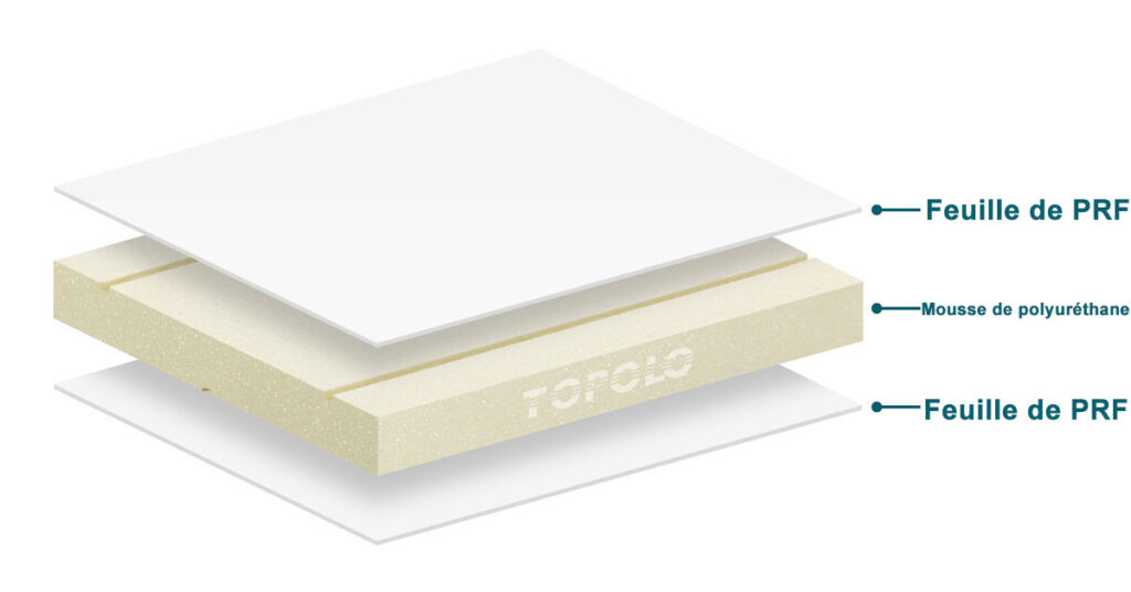Afin d’améliorer la durabilité et la rigidité des panneaux, nous avons également développé un revêtement de renfort en PRFV thermoplastique (CFRT). Ce matériau est non seulement plus rigide, mais aussi plus durable, ce qui le rend idéal pour les applications exigeant une résistance et une durabilité accrues. De plus, d’un point de vue environnemental, il est entièrement recyclable.