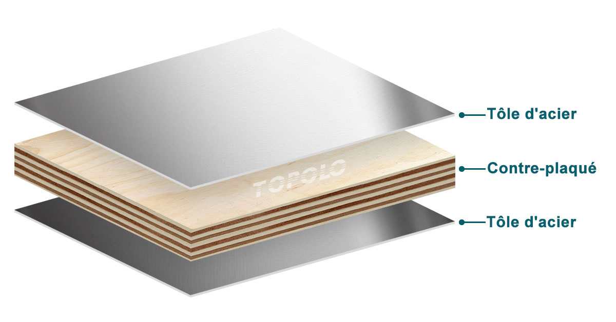 Les panneaux en contreplaqué d’acier sont fabriqués en collant de fines feuilles d’acier. Ils allient la robustesse de l’acier à la stabilité du contreplaqué, ce qui en fait un matériau durable et polyvalent pour la construction et l’aménagement intérieur. Ces panneaux sont disponibles avec un parement en acier simple ou double.