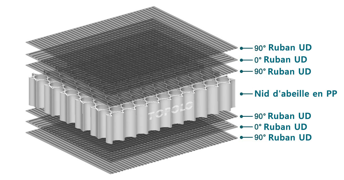 - Noyau : nid d’abeille en polypropylène (PP). (Densité : 80-120kg/m³)