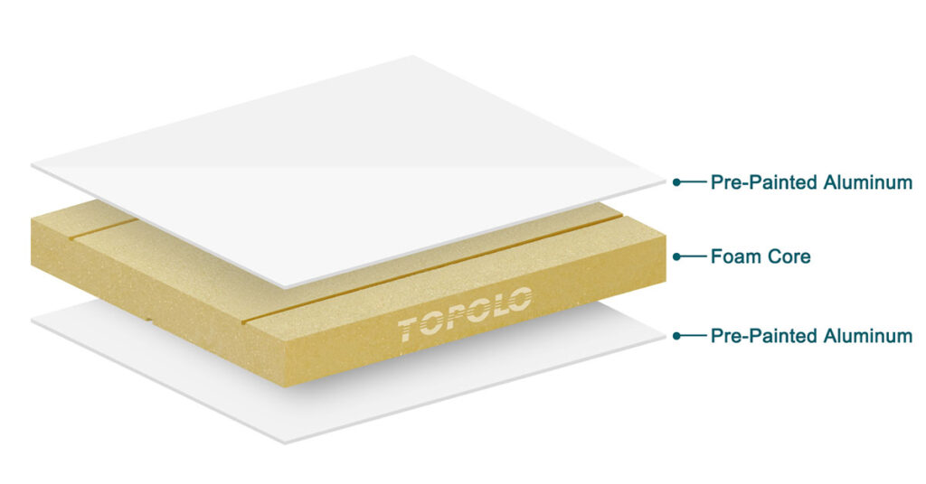 - Structure du panneau : feuille d’aluminium + noyau en mousse.