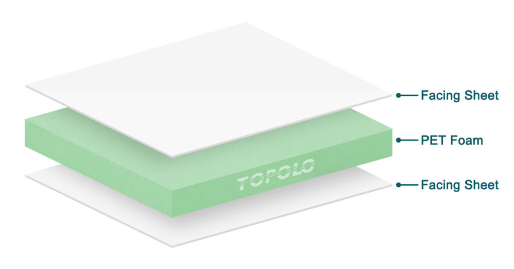 - Noyau en mousse de polyester : Fabriqué à partir de mousse de polyester extrudé, il a une bonne résistance à l’eau. Il est plus dur que les autres mousses (XPS, PU, PVC, etc.). Par conséquent, les panneaux sandwich en PET peuvent généralement être rendus plus minces et plus légers.