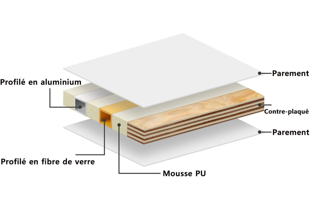 Une structure sandwich typique, souvent utilisée dans des pièces où les exigences de résistance ne sont pas élevées.