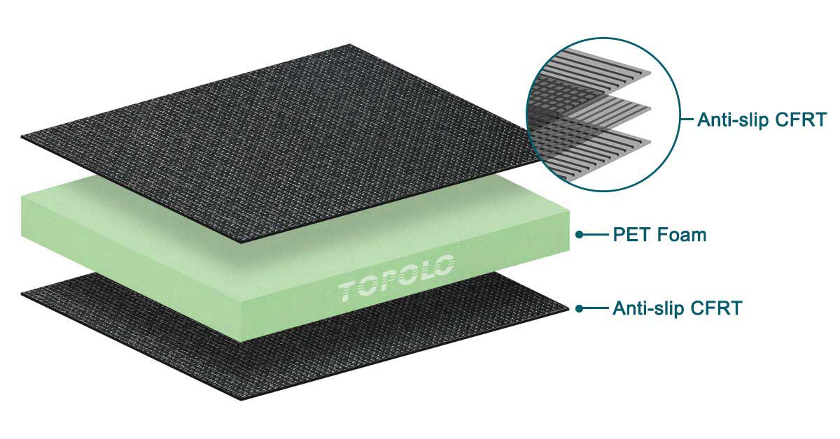 La couche antidérapante est un matériau composite CFRT (thermoplastique renforcé de fibres continues) avec une texture antidérapante dense.